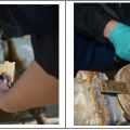 ①在外封塑料袋里取出一次性手套戴上,克漏带拆封前先予以搓揉以让树脂分布更均匀,因施工包覆时间长,建议由两个人共同操作,其中一人协助施工,施工前准备一个盛水的喷壶。克漏带经搓揉后拆封取出不泡水直接包覆,缠绕时持续搓揉使其发泡,同时由另一人将喷壶对准已缠绕于修复区上的克漏带喷水(注意避免将水喷在整卷克漏带上,以免提早硬化)。